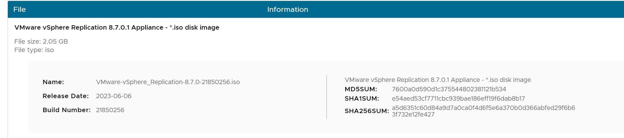 | VMware-vSphere_Replication-8.7.0-21850256.iso | 2.1 GiB | 2023-Jun-06 16:54 |